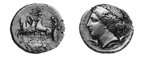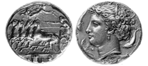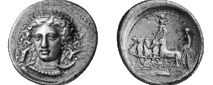 AR dekadrachm 39.46-44.77 162 quadriga /hd Arethusa or Persephone