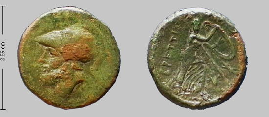 Obv. hd Ares, wearing crested Corinthian helmet Rev. Hera Hoplosmia advancing with hd facing, holding large shield and spear; owl?, hd cow facing? and thunderbolt in field to r., text: BPETTION