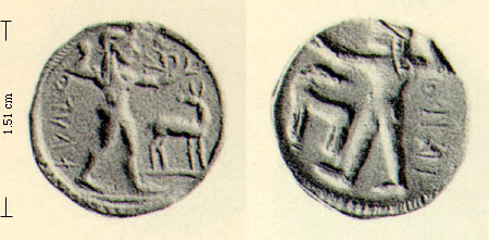 Obv. Apollo walking, holding laurel-branch and bearing a small running figure; before, stag, looking back. l. text KAVLO