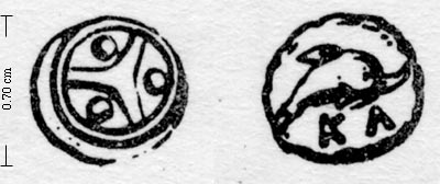 Hands Class III 0.14 g SNG BMC Cumae 24 Hands (1909) Class III 1. dolphin/wheel 3 spokes 0.14 SNG BMC 24 (this one) 2. dolphin/wheel 4 spokes