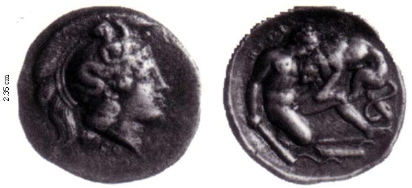 Obv. hd Atheana wearing Attic helmet decorated with Scylla. Hair bound by a fillet in a knot Rev. Heracles kneeling r wresling lion