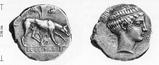 Obv. hound/dog sniffing, three stalks of barley behind, SEGESTAIIB