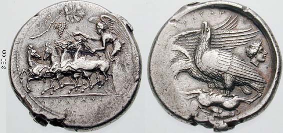 Obv. fast quadriga driven by Nike, bunch of grapes above; AKRAGANTINON