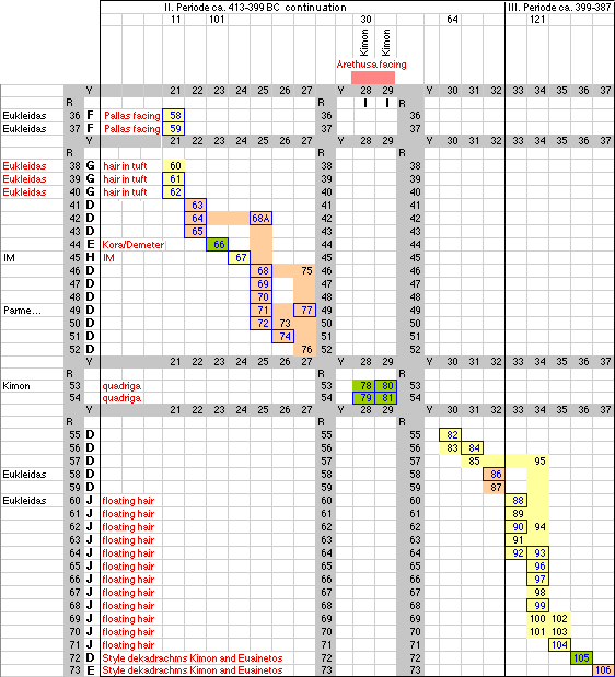 Die-coupling of "Die Tetradrachmenprägung von Syrakus in der Periode der Signierende Künstler" by Lauri O. Th. Tudeer (1913) in ZfN 30 pp 1-292 V: Vorderseite (Obverse) on the horizontal axes, R: Rückseite (Reverse) on the vertical axes Linked die-couples (either by obverse or by reverse) are indicated by colors. Tudeer numbers in the data base are indicated by blue borders and are clickable. The dates of the periods are by Tudeer and may differ from modern dates. Hairstyles of Arethusa are indicated by letters: