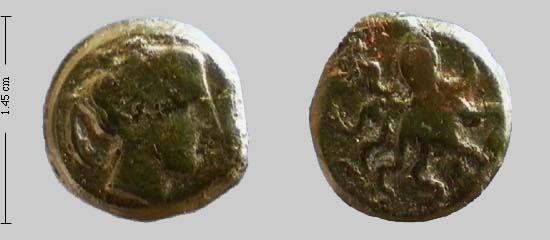 Obv. hd female (Arethusa?) hair in korymbos, dolphins before and behind; SURA