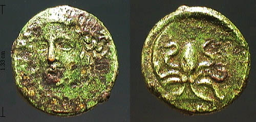 Calciati 29 1.78 g munthandel G. Henzen, July 2000 no. b obverse derived from the facing Arethusa by Kimon some exemplars signed by Kimon usually attributed to Exakestidas (E) reverse three pellets on an exemplar in the Museum of Syracuse (tetras of a theoretical litra of 8 g) 1st specimen 2nd specimen