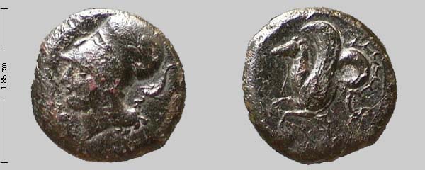 Obv. hd Athena, wearing Corinthian helmet (with olive-wreath), SURA