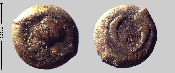 Calc. 67 Rev. pellet between the heads of the dolphins.