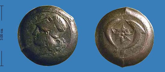 Obv. head of Athena left, wearing Corinthian helmet bound with olive-wreath, SURA before