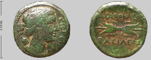 Rev. winged thunderbolt. Text above: AGAQOKLEOS, below BASILEOS.