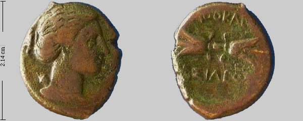 Rev. winged thunderbolt. Text above: AGAQOKLEOS, below BASILEOS.