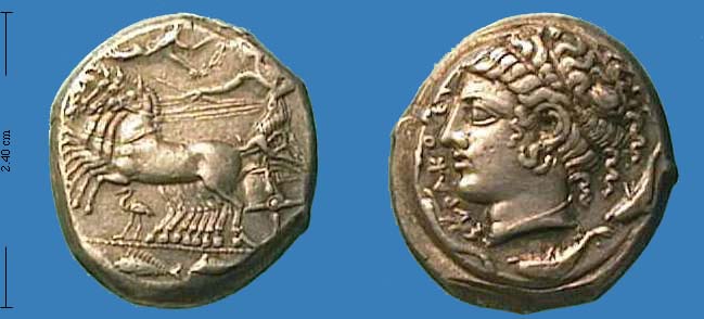 Obv. galloping quadriga driven by male charioteer; Nike flying above, crowning the charioteer; heron below the horses. In ex. fish chased by dolphin.
