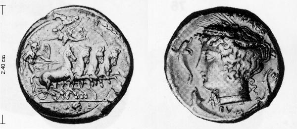Obv. galloping quadriga driven by winged young god (Eros). Nike flying above, crowning the charioteer, in ex: dolphin, Scylla, fish