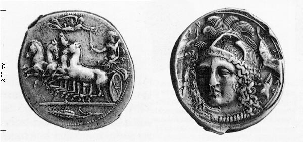 Obv. galloping quadriga driven by female charioteer; Nike flying above, crowning the charioteer, in ex: ear of barley