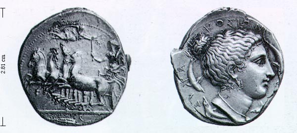 Obv. galloping quadriga driven by female charioteer; Nike flying above, crowning the charioteer, in ex: ear of barley
