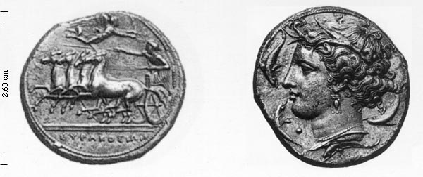 Obv. galloping quadriga driven by female charioteer; Nike flying above, crowning the charioteer, in ex: SURAKOSIW