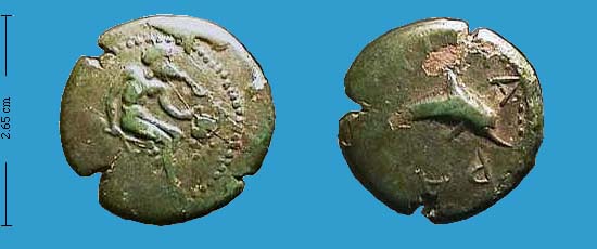 Obv. Hephaistos seaed, holding hammer and kantharos Rev. dolphin, LIPAPAION.