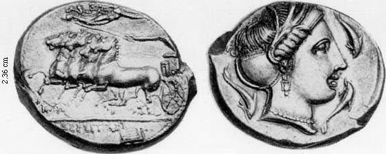 Obv. quadriga, Nike above crowning the charioteer, above ex. signed by KLE, in ex. QERMITAN and altar