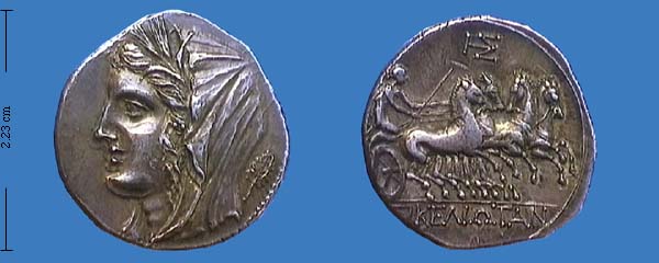 Obv. hd Persephone veiled and wreathed Rev. quadriga driven by Nike; text SIKELIOTAN