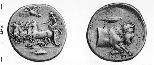 Rev. protome river-god Gelas as man-headed bull, GELAS below, barley-grain above