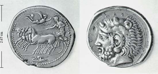 Westermark & Jenkins 133.4 17.15 g P.R. Franke and M. Hirmer (1964, 1972) Die Griechische Münze (no. 147) 17.02 g according to Franke and Hirmer private collection 130-132 Obv. quadriga l., in ex. KAMAPINAION Rev. bearded Herakles l. in lion-skin 133-134, 136-142 Obv. in ex. heron 135 Rev. bearded Herakles r. 143 Obv. quadriga r., in ex. column Rev. bearded Herakles l. 144 in ex. fish 145-148 in ex. corn grain Rev. beardless Herakles l. 149-150, 152 in ex. 2 amphorae 151 Rev. bearded Herakles l. 153-157 Rev. beardless Herakles r.