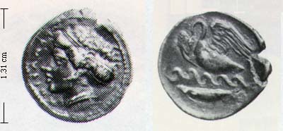 Obv. head Kamarina; text KAMAPINA Rev. swan swimming with open, flapping wings; waves and fish below