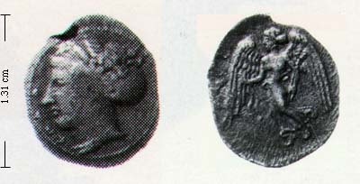 Obv. head Kamarina; text KAMA Rev. Nike flying, holding fillet and caduceus; text KAMA