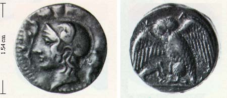 Obv. head Athena wearing Attic helmet Rev. owl frontal with outspred wings holding lizard; text KAMA, in ex. 3 pellets