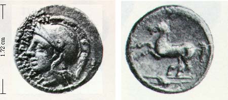 Obv. head Athena wearing Attic helmet; text KAMAPINAION Rev. horse prancing; in ex. corn-ear