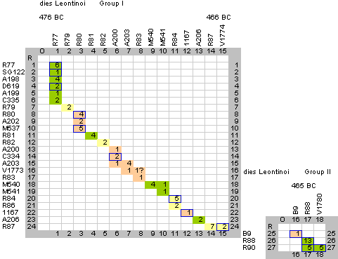 Die-coupling of the tetradrachms of Leontinoi O: Obverse on the horizontal axes, R: Reverse on the vertical axes Linked die-couples (either by obverse or by reverse) are indicated by colors. For more information about a specific die combination click the number. Numbers (die combinations) with blue borders are illustrated. See the concordance of the vW-numbers: vW-provenance or provenance-vW