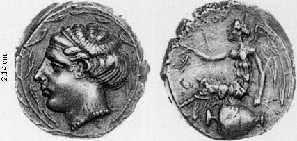Obv. hd. nymph Terina, within olive wreath border