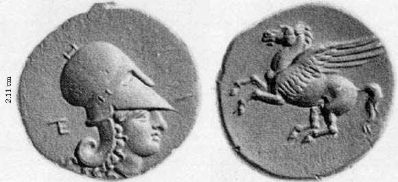 Obv. hd. Athena, wearing Corinthian helmet, TE