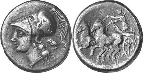 HNI 434 6.94 g Gorny & Mosch Giessener Münzhandlung > Auction 147 2006 lot 1073 Estimate 150 EUR, realized 230 EUR type HNI 434 KAMPANIEN CALES Didrachme (6,94 g.), 334 - 268 v. Chr. Vs.: Kopf der Athena mit korinthischem Helm n. l., dahinter Eule. Rs.: CALENO, von Nike gesteuerte Biga n. l. SNG Cop. 305 (stgl.). Dunkle Tönung, Vs. Kratzer, ss