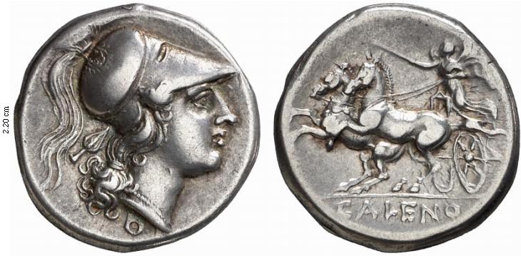 Rs: CALENO. Victoria mit Treibstab in galoppierender Biga nach links fahrend.