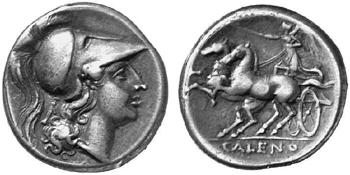 HNI 434 7.23 g UBS Gold & Numismatics > Auction 56 2003 lot 13 Estimate 1000 CHF, realized 900 CHF (approx. 664 USD) type HNI 434 Cales. Didrachm c. 268/260. Head of Athena in Corinthian helmet to r. Rev. Nike with kentron in r. hand driving biga to l. In exergue CALENO. 7,23 g. Sambon 897. Jameson 66. SNG Lloyd 52. Attractive patina. Very fine.