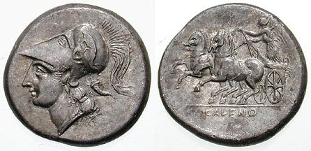 CALENO in exergue, Nike in biga galloping to left, holding reins in both hands.