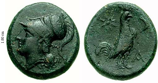 HNI 435 6.17 g Classical Numismatic Group > Mail Bid Sale 61 2002 lot 7 Estimate 150 USD, realized 90 USD type HNI 435 CAMPANIA, Cales. Circa 265-240 BC. Æ 18mm (6.17 gm). Helmeted head of Minerva left / Cock right. SNG ANS 199; Rutter HN 435. Near VF, dark green to brown patina. From the David Freedman Collection.
