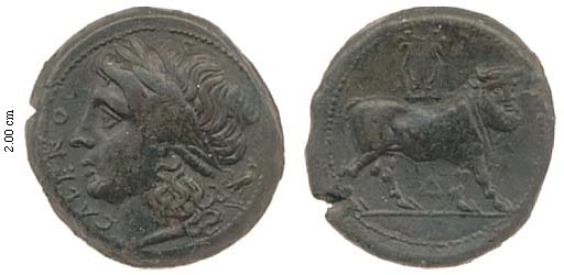 HNI 436 .... g Numismatica Ars Classica > Auction P 2005 lot 1002. Estimate 200 CHF type HNI 436 Campania, Cales (c. 280-270 B.C.), AE 20 mm, laureate head of Apollo left, cock standing right behind, caleno, rev. man-headed bull standing right, lyre above, Ä below (SNG Morcom 75 var.; SNG ANS 175 var.; Laffaille 12 var.; BMC 14), dark green-brown patina, good very fine