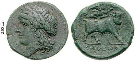 HNI 436 6.14 g Classical Numismatic Group > Mail Bid Sale 60 2002 lot 30 Estimate 200 USD, realized 180 USD type HNI 436 rev. man-faced bull Nike above CAMPANIA, Cales. 265-240 BC. Æ 20mm (6.14 gm). Laureate head of Apollo left / Man-headed bull standing right, crowned by Nike above. SNG ANS 184 var. (shield). Good VF, attractive green patina, porous reverse. Ex Aes Rude Auktion 9 (7 April 1983), lot 4.