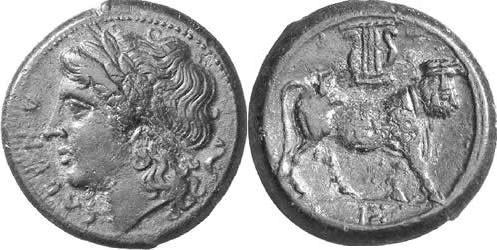 Vs.: Kopf des Apoll mit Lorbeerkranz l., dahinter Delfin, davor CALENO.