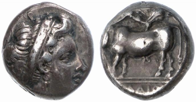 HNI 605 7.12 g Dr. Busso Peus Nachfolger > Auction 384 2005 lot 15 Estimate 150 EUR type HNI 605 GRIECHISCHE MÜNZEN (GREEK COINS) -Kampanien -Nola Didrachme nach neapolitanischem Vorbild um 380 v. Chr. Nymphenkopf / Menschenköpfiger Stier, darüber schwebende Nike mit Kranz. SNG ANS 556. 7.12 g. Sehr schön