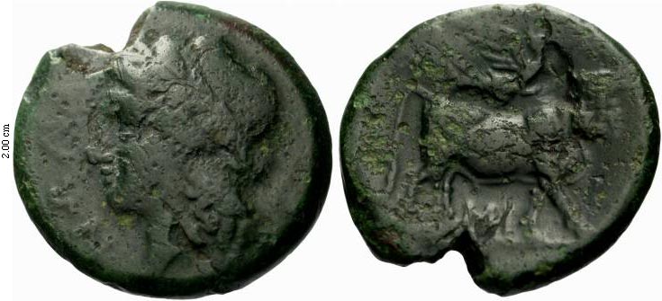 HNI 607 6.84 g Numismatica Ars Classica > Auction O 2004 lot 1034 Estimate 400 CHF type HNI 607 A Selection of Coins of Magna Graecia and Sicily from the A.D.M. Collection Campania. Nola. d=20 mm Bronze c. 300-250, 6.84 g. Laureate head of Apollo l. Rev. Man-headed bull r. crowned by Nike. SNG Cop. 565. H.N. 607. Very rare. Dark green patina, F