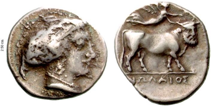 Rutter 20 (O8/R14) 7.27 g Numismatica Ars Classica > Auction P 2005 lot 1316 Estimate 400 CHF type HNI 605 Greek Coins Campania Nola. d=25 mm Didrachm c. 400-385, AR 7.27 g. H.N. 605. SNG France 1087 (=). Rutter 20. Toned, die-breaks on obverse and VF