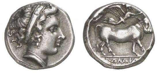 Rutter 53 (O22/R34) 7.22 g Dr. Busso Peus Nachfolger > Auction 396 2008 lot 18 Estimate 450 EUR, realized 480 EUR type HNI 605 GRIECHISCHE MÜNZEN Kampanien Nola Didrachme 400/385 v. Chr. Nymphenkopf / Menschenköpfiger Stier, darüber schwebende Nike mit Kranz. SNG ANS 555; Rutter 53. 7.22 g. Fein getönt, Selten Sehr schön