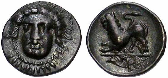HNI 619 0.56 g Jean Elsen & ses Fils S.A. > Auction 94 2007 lot 57 Estimate 300 EUR, realized 300 EUR type HNI 619 CAMPANIE, PHISTELIA, AR obole, 325-275 av. J.-C. Droit : Tête de nymphe de face, légèrement tournée vers la gauche. Revers : Lion à gauche sur une ligne de terre perlée. A l'exergue, serpent à gauche. Ref.: SNG ANS 584; SNG Paris 1134. 0,56g. Corrosion au bas du revers. Patine noire. presque Superbe a. EF