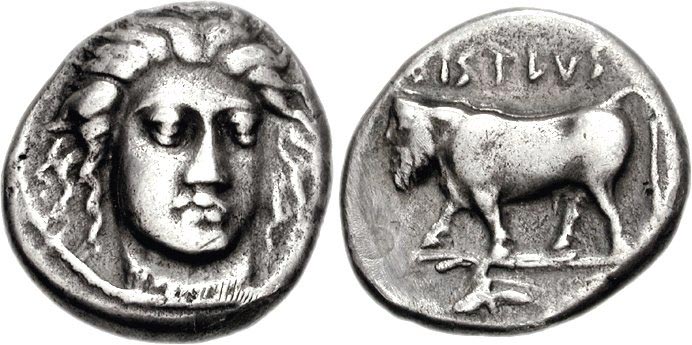 Rutter 5 (O4/R5) 7.10 g Classical Numismatic Group > Mail Bid Sale 73 2006 lot 12 Estimate 300 USD, realized 850 USD type HNI 611 CAMPANIA, Phistelia. Circa 405-400 BC. AR Nomos (7.10 g, 4h). Female head facing slightly right / Man-headed bull standing left; in exergue, dolphin left. Rutter 5 (PO 4/PR 5); SNG ANS 563-565 (same obv. die); HN Italy 611. Good Fine, toned, minor porosity, light cleaning marks. Rare. From the David Herman Collection.