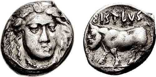 Rutter 6 (O4/R6) 7.40 g Classical Numismatic Group > Mail Bid Sale 69 2005 lot 30 Estimate 300 USD, realized 475 USD type HNI 611 CAMPANIA, Phistelia. Circa 405-400 BC. AR Nomos (7.40 gm, 9h). Female head facing slightly right / Man-headed bull standing left; [dolphin in exergue]. Rutter 6 (O4/R6); SNG ANS 565 (same obverse die); HN Italy 611. Good Fine, struck with worn dies. Very rare. Lot includes a certificate of authenticity by David Sear.