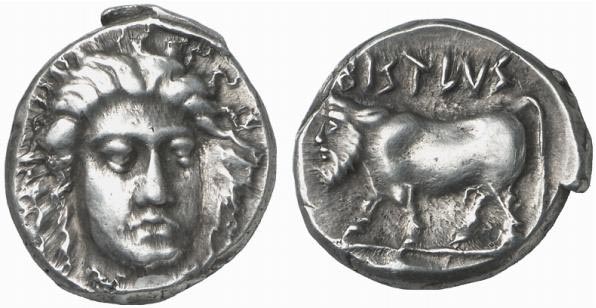 Rutter 6h (O4/R6) 7.44 g Fritz Rudolf Künker GmbH & Co. KG > Auction 124 2007 lot 7806 Estimate 750 EUR, realized: 1,350 EUR type HNI 611 GRIECHISCHE MÜNZEN (GREEK COINS) CAMPANIA PHISTELIA. AR-Didrachme, 405/400 v. Chr.; 7.44 g. Weiblicher Kopf fast v. v.// Androkephaler Stier l. Rutter, Historia Numorum 611; Rutter, Campanian Coinages 6 h (dies Exemplar). Attraktives Exemplar, sehr schön + Exemplar der Auktion Leo Hamburger 96, Frankfurt am Main 1932, Nr. 9.