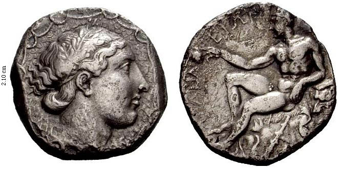 Van Keulen 1 7.53 g Numismatica Ars Classica Auction 29 11 May 2005 lot 28 type vK001 d=21 mm Nomos circa 415-400, AR 7.53 g. Wreathed head of Athena r. hair bound at nape of neck, against background of aegis. Rev. HERAKLEIWN Heracles seated l. on rock draped with lion skin, holding one handled jug in r. hand and supporting himself on l. arm; below, club and shell resting against rock. Historia Numorum Italy 1362. SNG ANS 45 (these dies). AMB 104 (these dies). Jameson 1232 (these dies). Work 1. Extremely rare. A very interesting and fascinating reverse composition. Minor area of porosity on reverse, otherwise good very fine This Nomos is among the oldest Heraclean issues. According to scholars, it is ascribable to a die-engraver from Taras. The coin bears an unusual representation of Athena: without helmet, but framed on the adorned background of the aegis (shield covered with goat-skin), surrounded by snakes. The reverse shows and equally unusual Heracles: the hero is not occupied in one of his amazing labours, instead he is caught at a moment of rest, reclining (this scheme was subsequently resumed by Croton on its later coins) on a rock draped with a lion-skin (the most characteristic attribute of the hero) and holding a chalice in his right hand. A club leans against the rock. The relationship between Heracles, wine, and the Dionysian world is known from various sources: myth (Heracles was at the service of the vine-dresser Sileus; Heracles and Folus), archaeology (the well-known drunken Heracles from Herculaneum, before 79 A.D.), and literature. The great lyric poet Stesichorus (VI cent. B. C.), probably born in Metauro (a Locrese colony not far from the modern Gioia Tauro in Calabria), refers in song to the struggle between the Centauri and Heracles over a pitcher of wine, a gift of Dionysus to the centraur Folus: "He took the right cup – it was a bowl / gigantic (nine litres / or thereabouts). He lifted it / he gulped down mixture offered him by Folus".