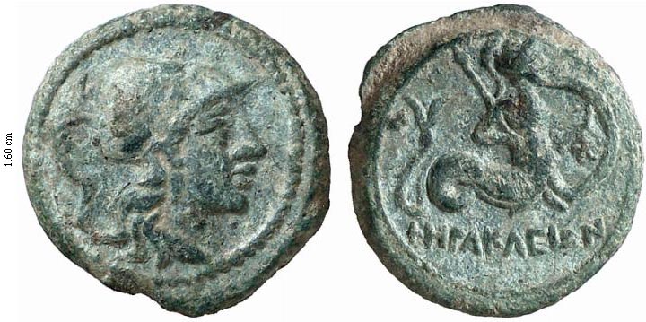 Rev. marine deity (Glaukos?) r with human torso and a fish's tale, carying shield and spear. Usually helmeted.